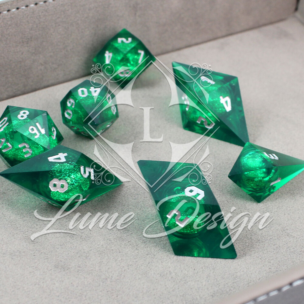 Kości RPG Płynny Środek Kryształy Zielone Ostre DnD Zestaw Kostki