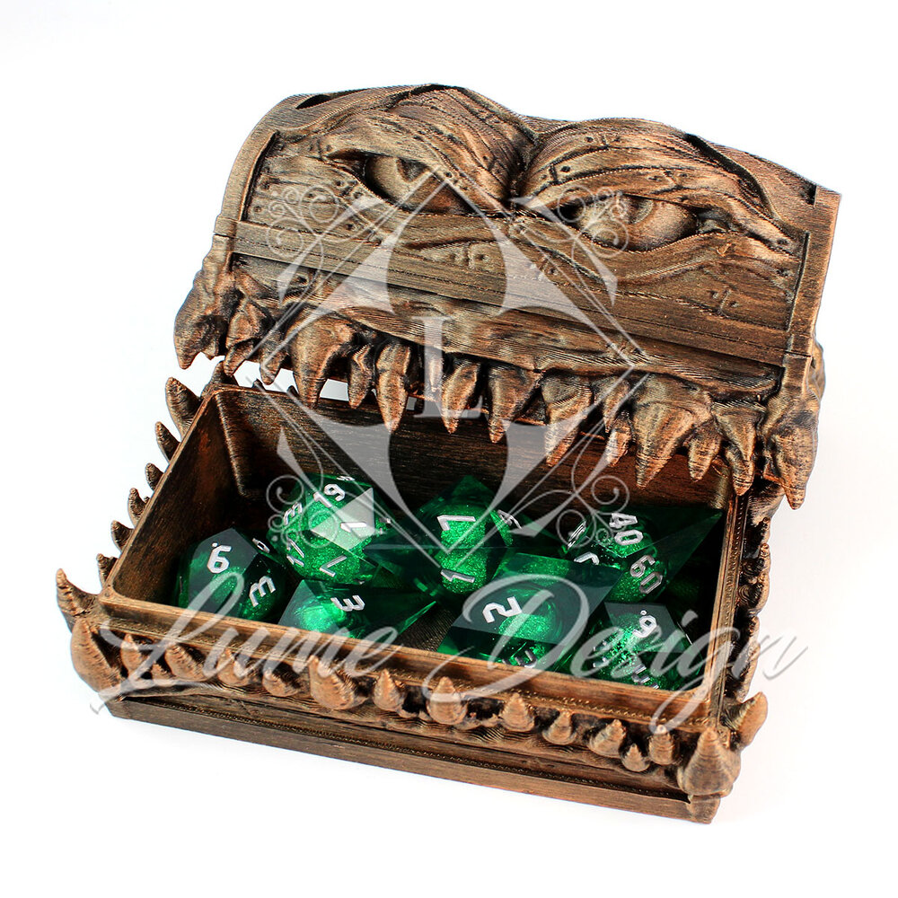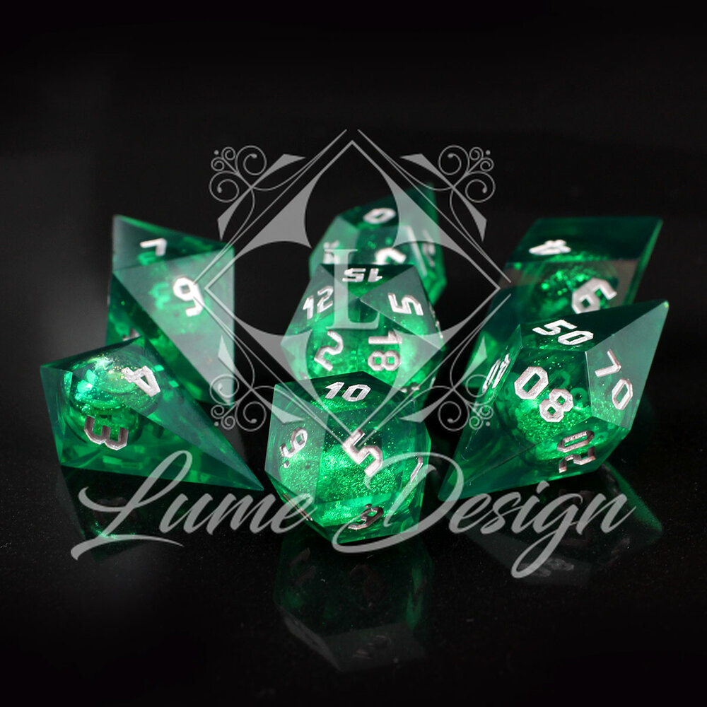 Efekt: Liquid Core – wnętrze każdej kostki skrywa płynną esencję z opalizującym, zielonym pyłkiem. Podczas rzutu pyłek wiruje hipnotyzująco, przypominając wizje wewnątrz magicznego kryształu.