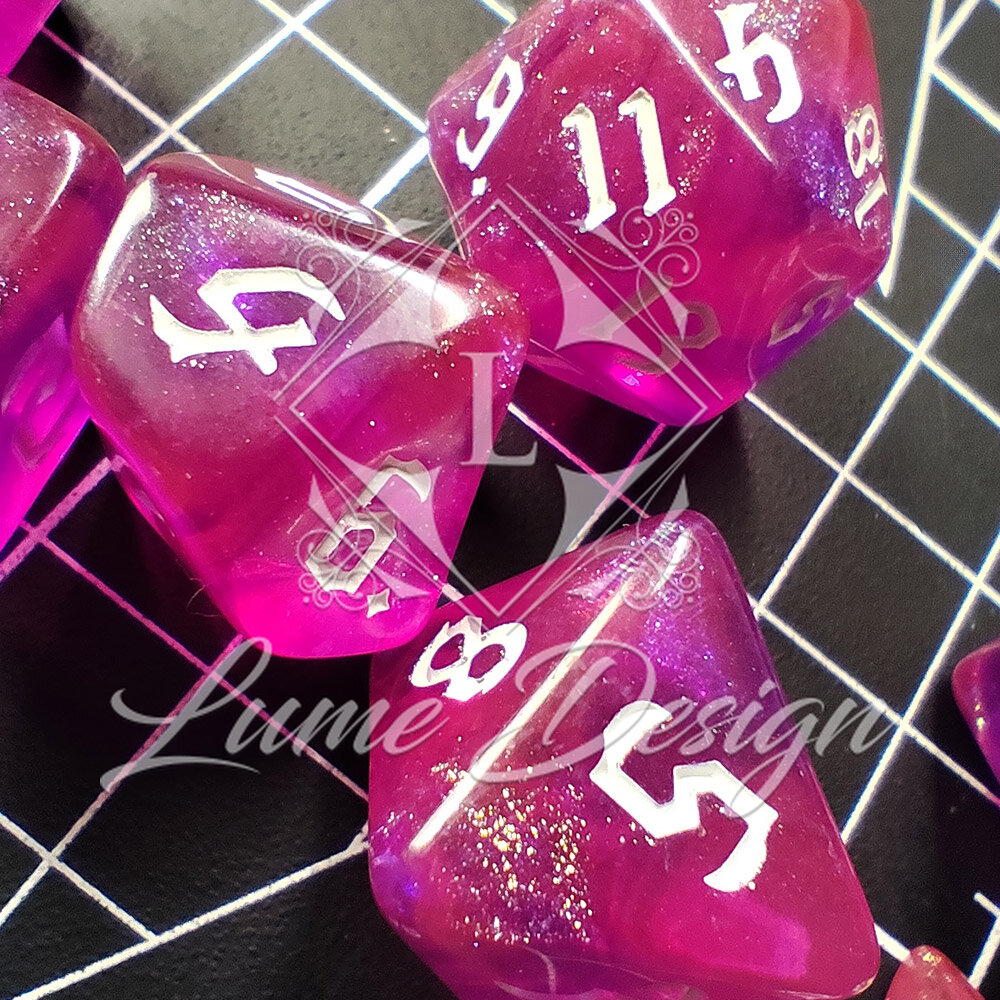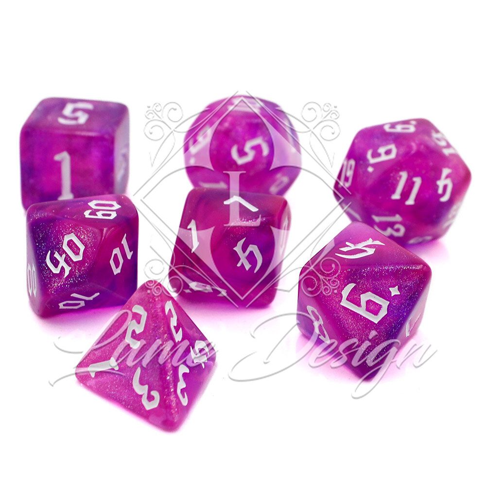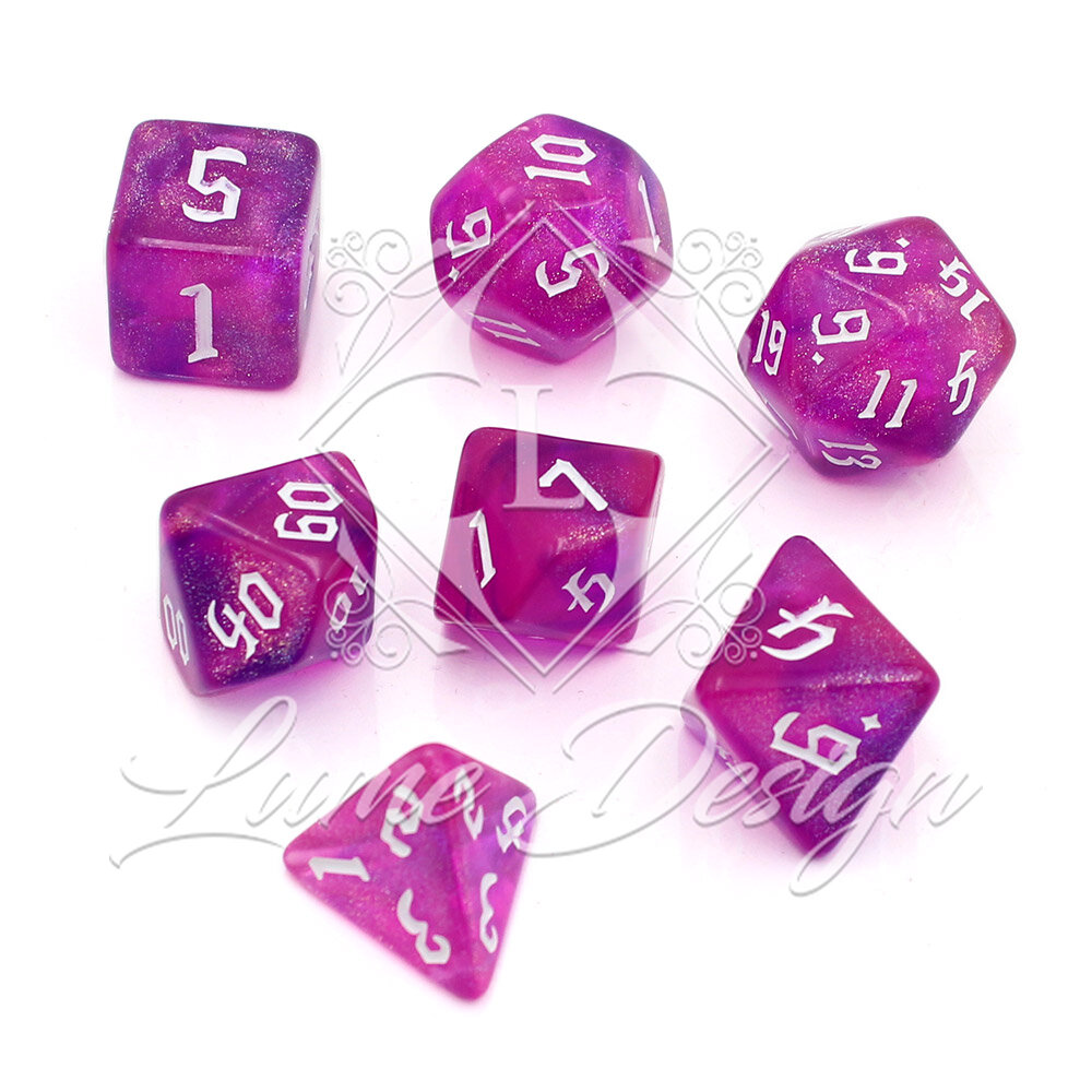 Zestaw ten tętni magiczną energią. To barwy Dzikiej Magii, zaklęć iluzji i eliksirów miłosnych. Brokatowy pył zatopiony w różowo-fioletowym tworzywie przywodzi na myśl wróżkowy pył z krainy Feywild. Kości te idealnie pasują do postaci barwnych, chaotycznych i pełnych życia.