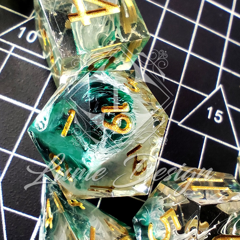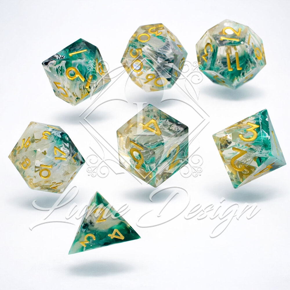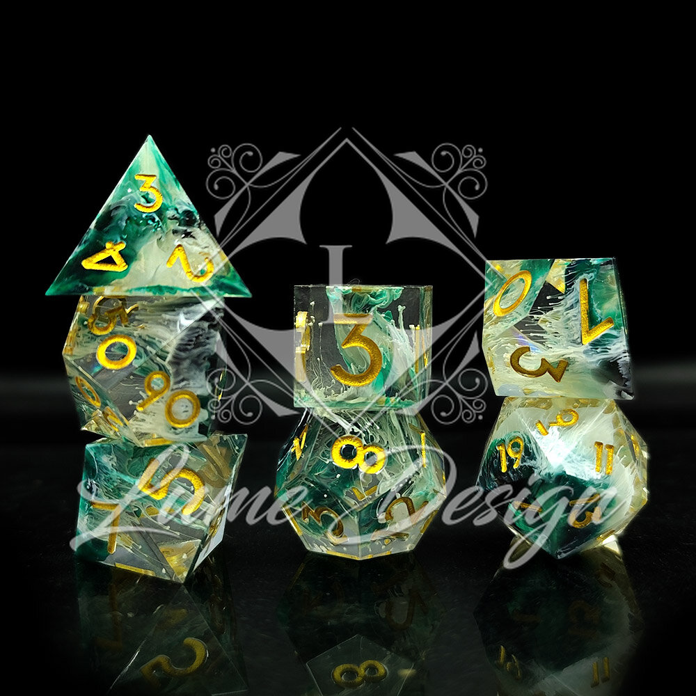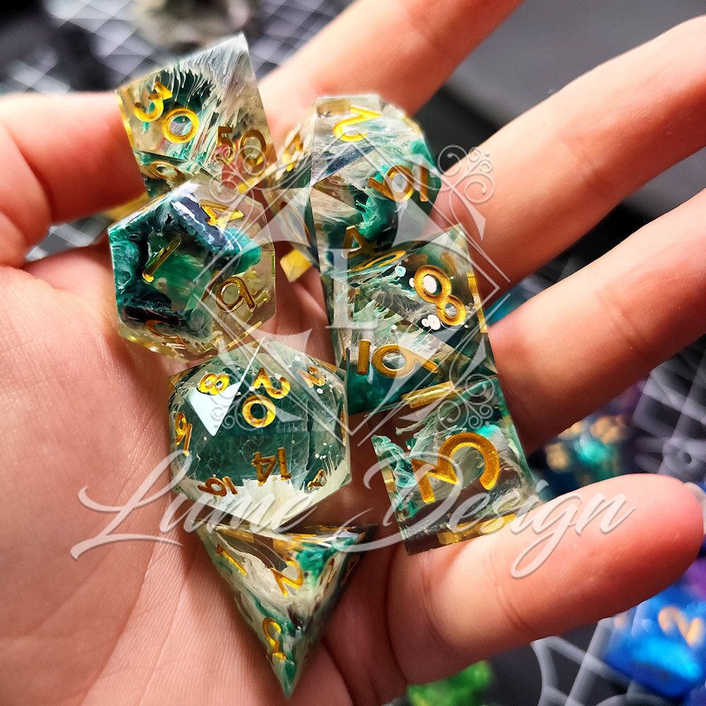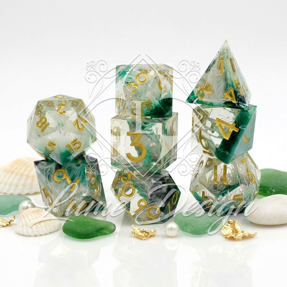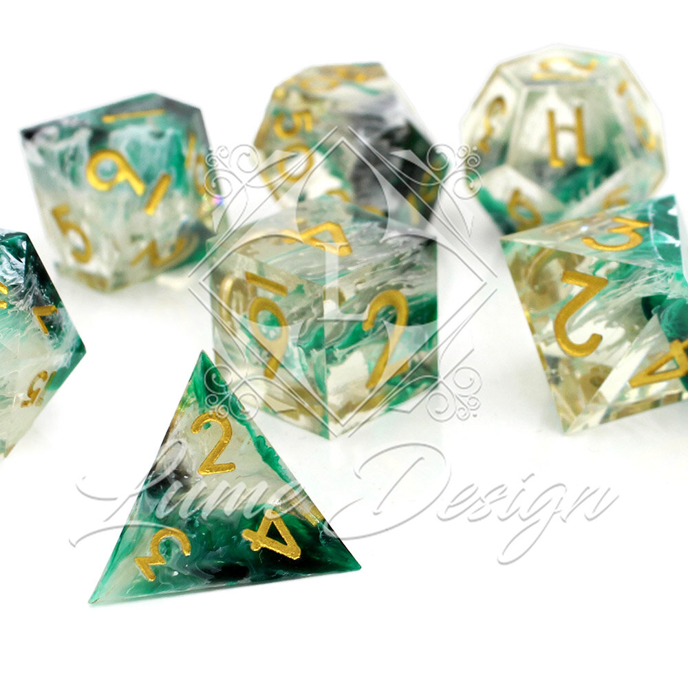 Kości RPG Sharp Edge Żywica Zielone Złote Zestaw DnD
