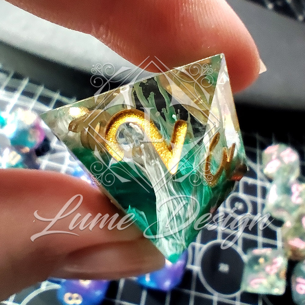 • Efekt: Wewnątrz przezroczystej bryły unosi się efektowne zjawisko "splash". Smugi zieleni i mlecznej bieli przeplatają się niczym dym lub magiczna esencja zaklęta w szkle. Każda kość ma unikalny, niepowtarzalny układ fal.