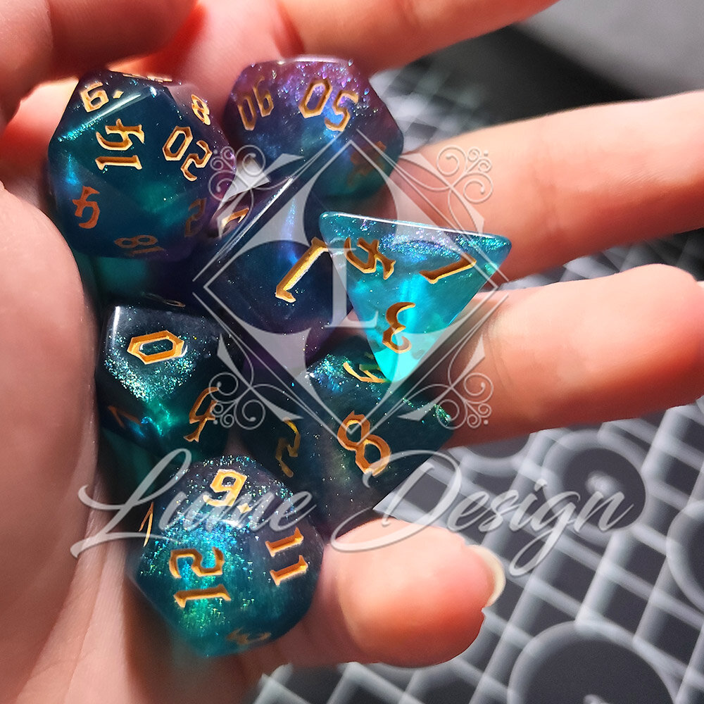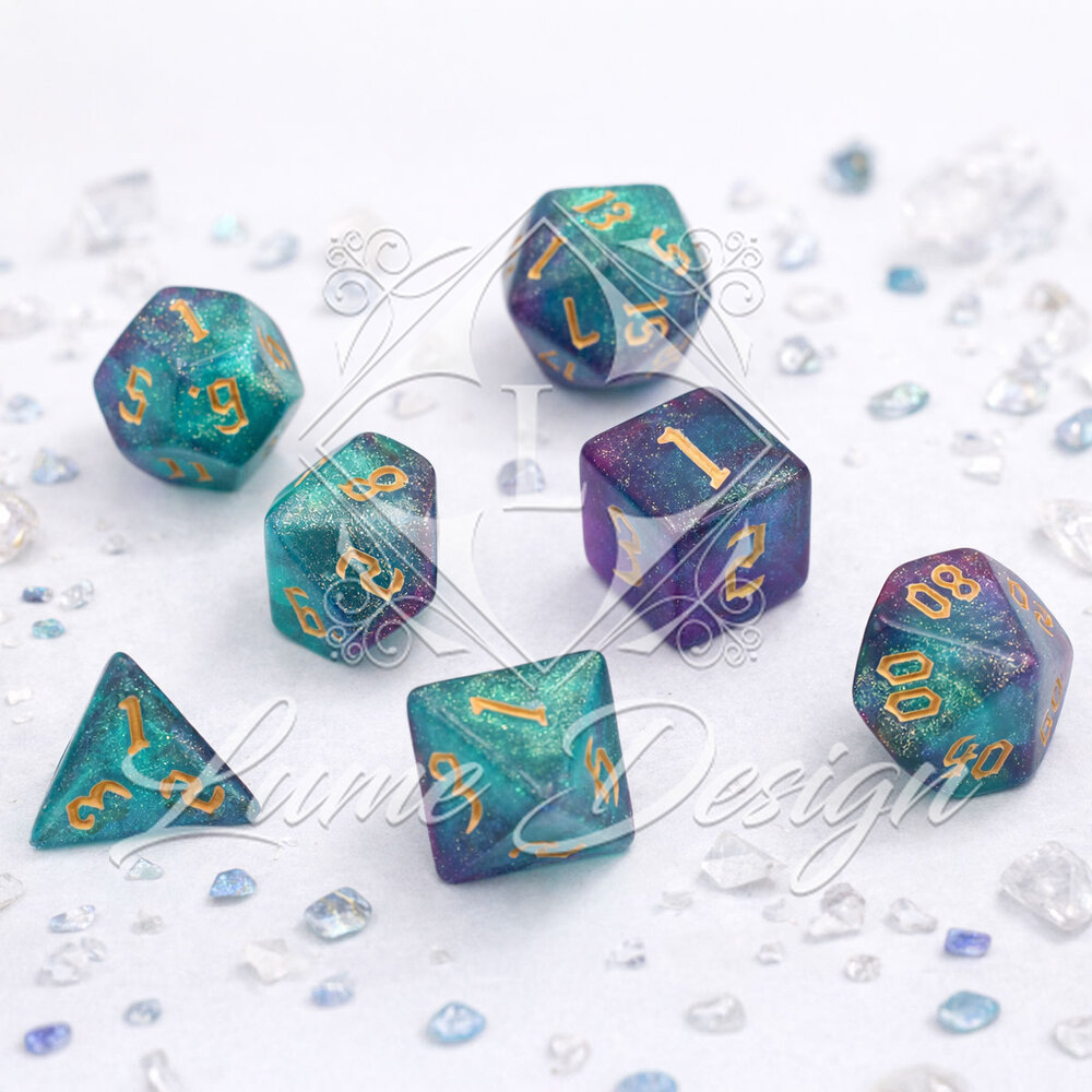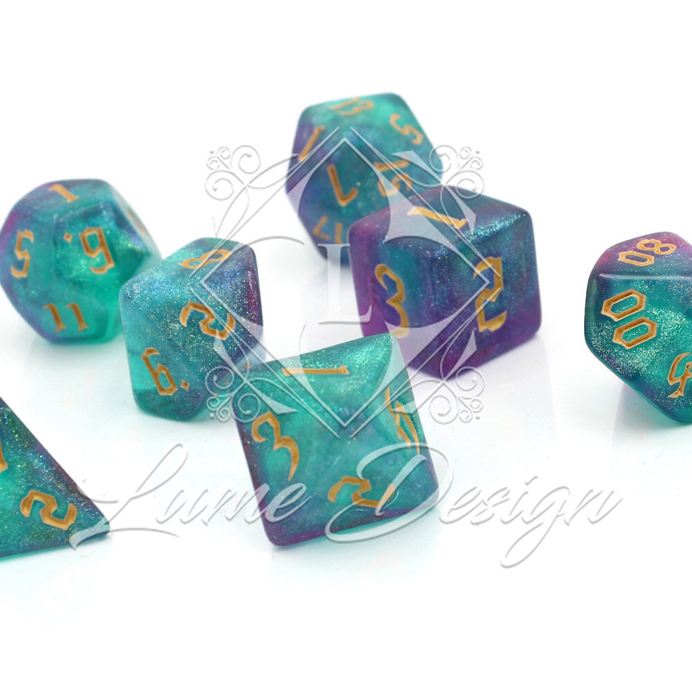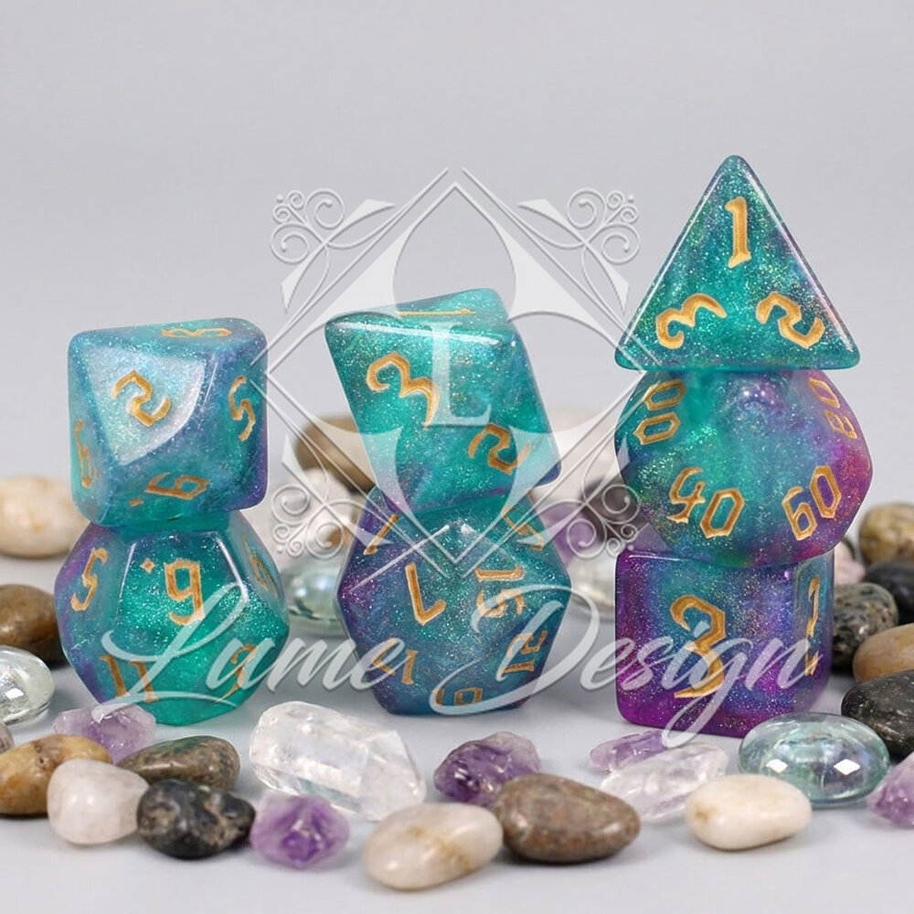Zestaw kości RPG Aurora Dreams turkusowo-fioletowe z brokatem