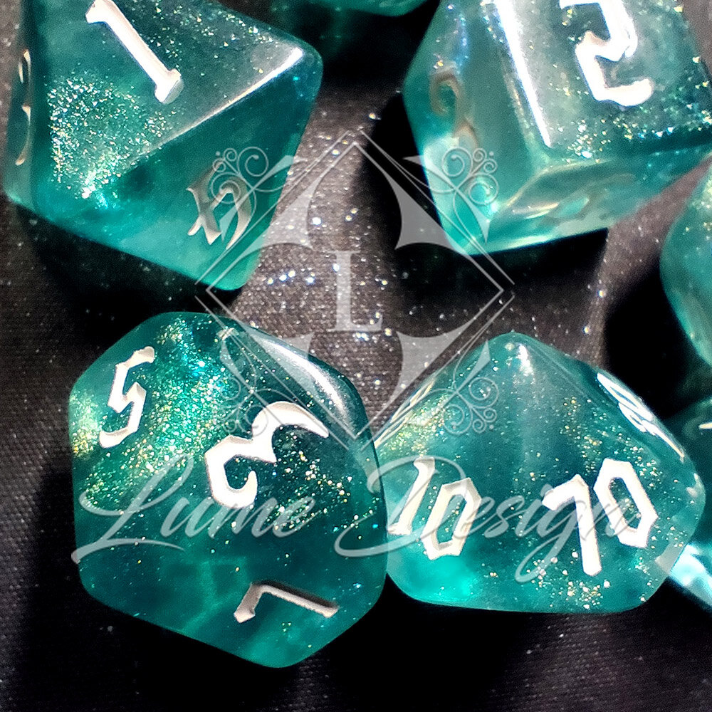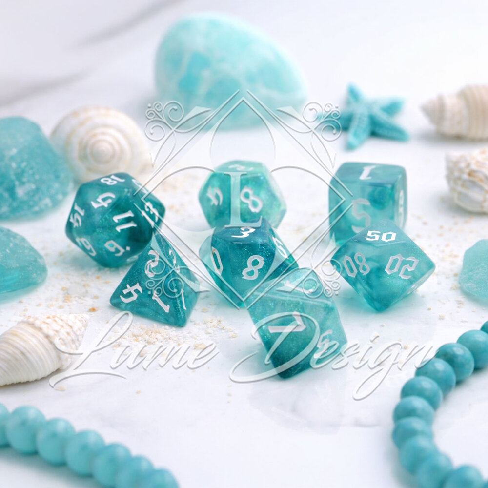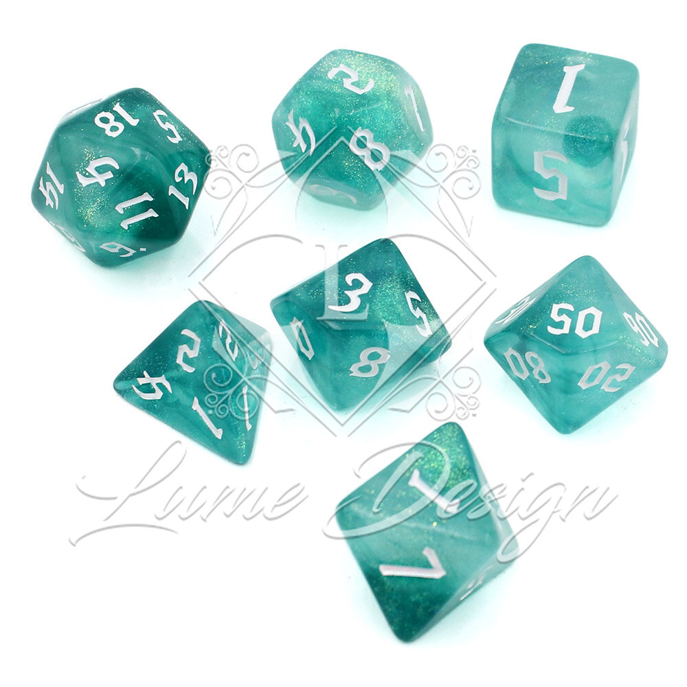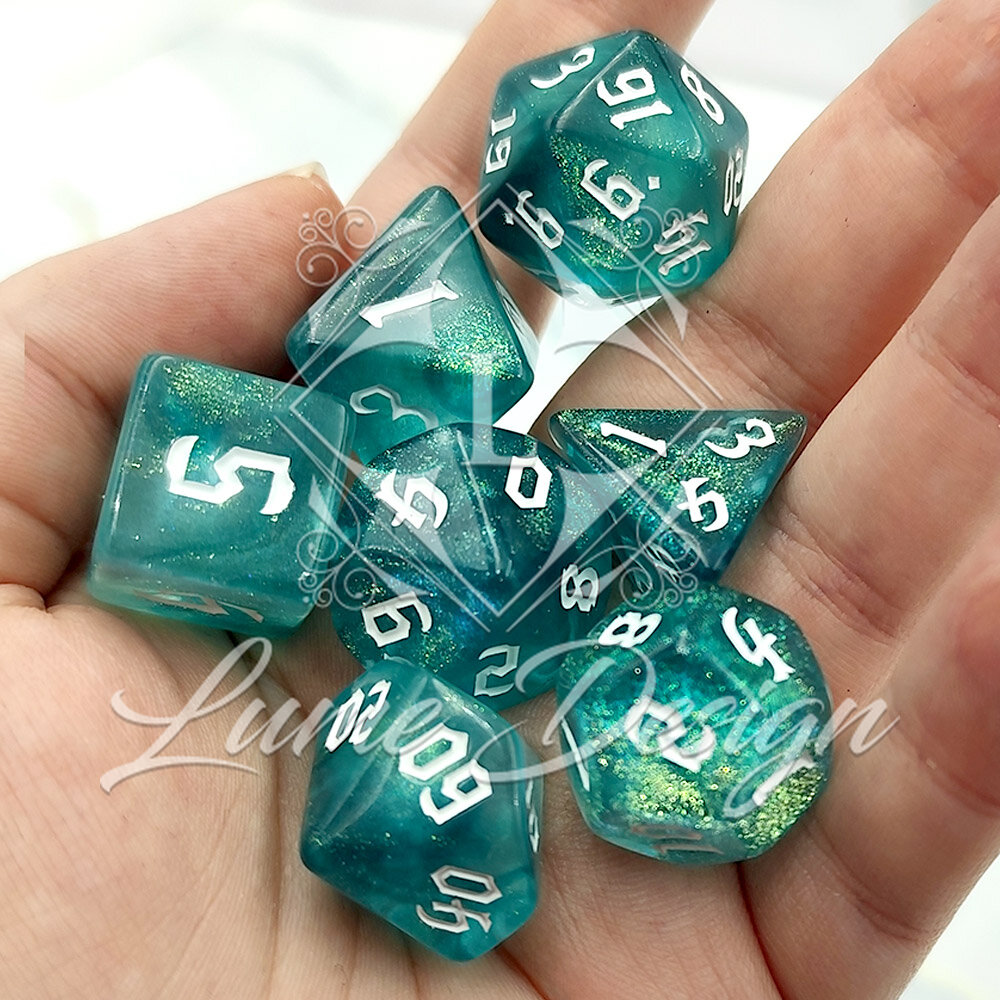 Kości te przywodzą na myśl skarby zatopione w lagunie lub magiczny wir na środku oceanu. Kolor balansuje między spokojnym błękitem a drapieżnym cyjanem, a brokat dodaje im magicznego, "mokrego" połysku. Idealny wybór dla Kapłana Domeny Burzy, Wodnego Genasi, żeglarza czy pirata szukającego przygód na Morzu Mieczy.