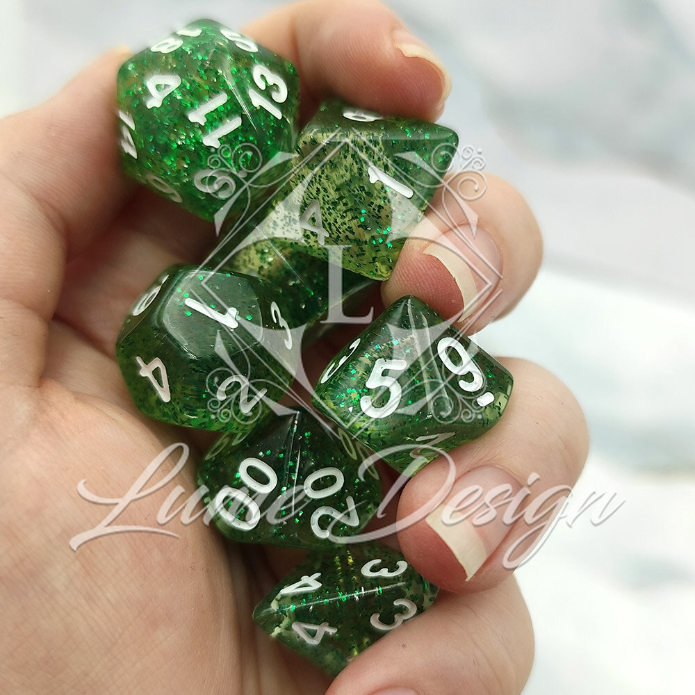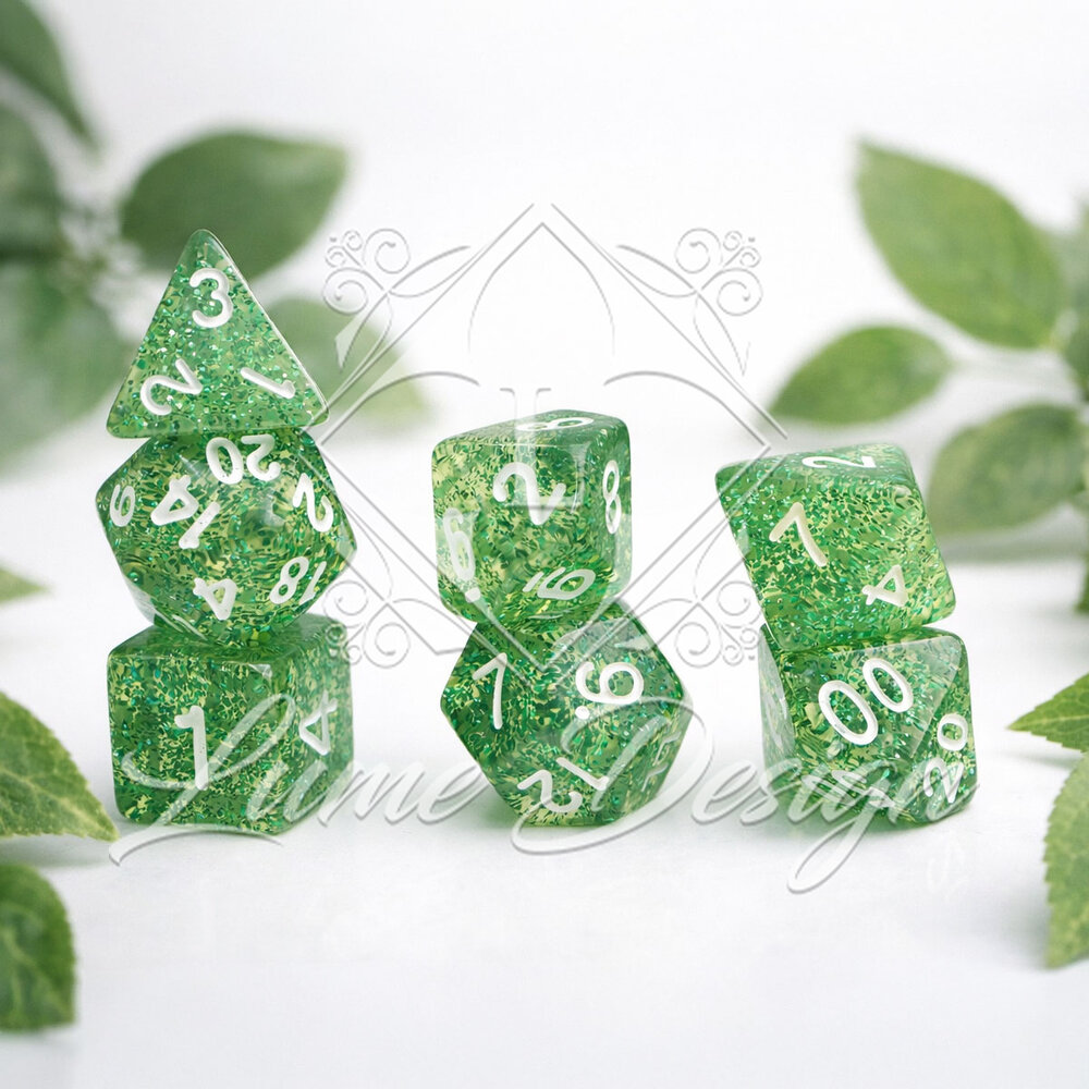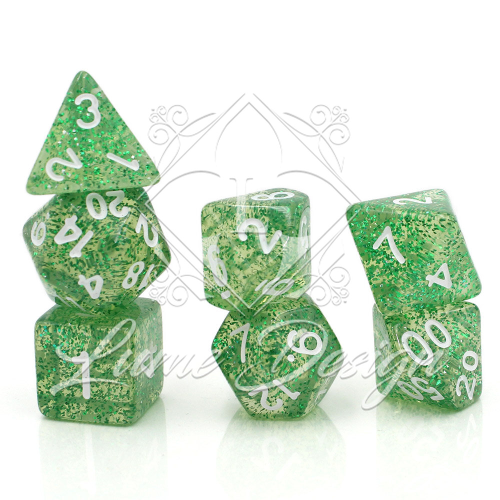 Kości RPG Zielone Brokatowe Zestaw DnD Akryl Transparentne