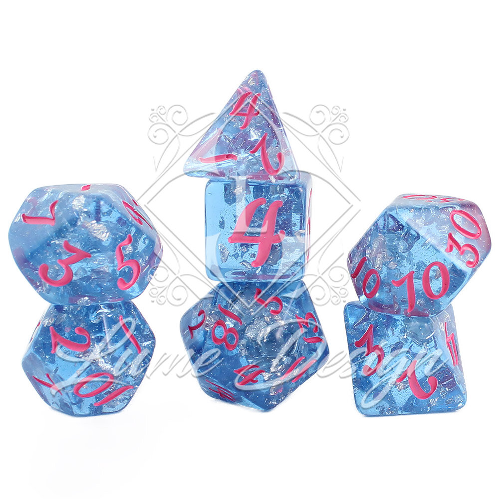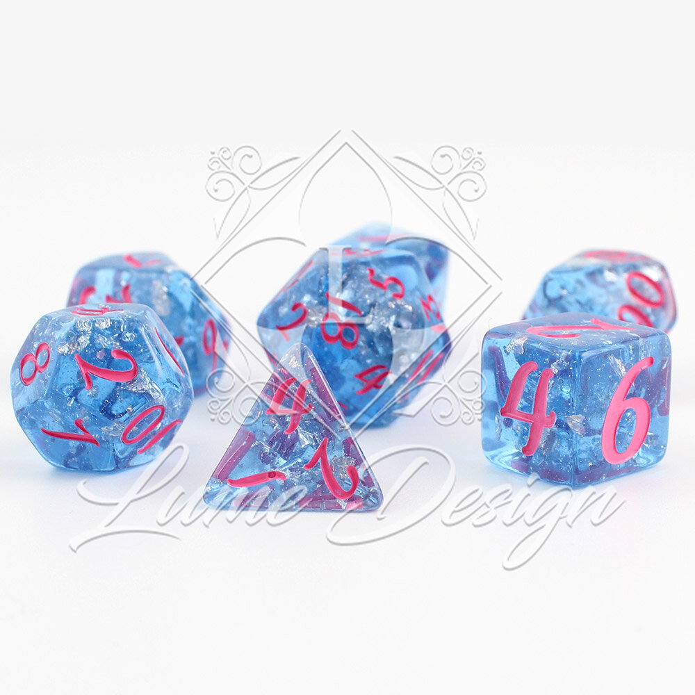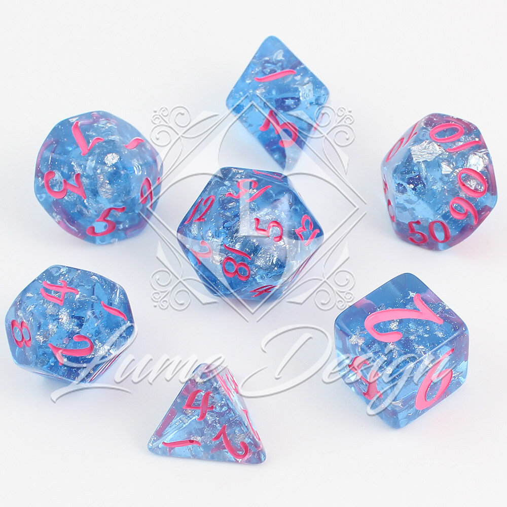 Klimatyczny zestaw 7 kości wielościennych do gier fabularnych RPG o lodowym charakterze.