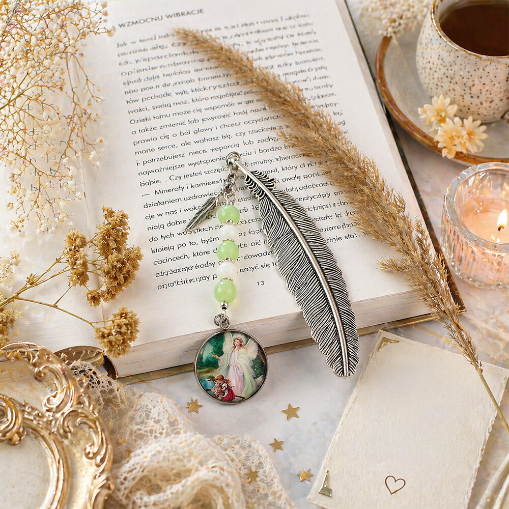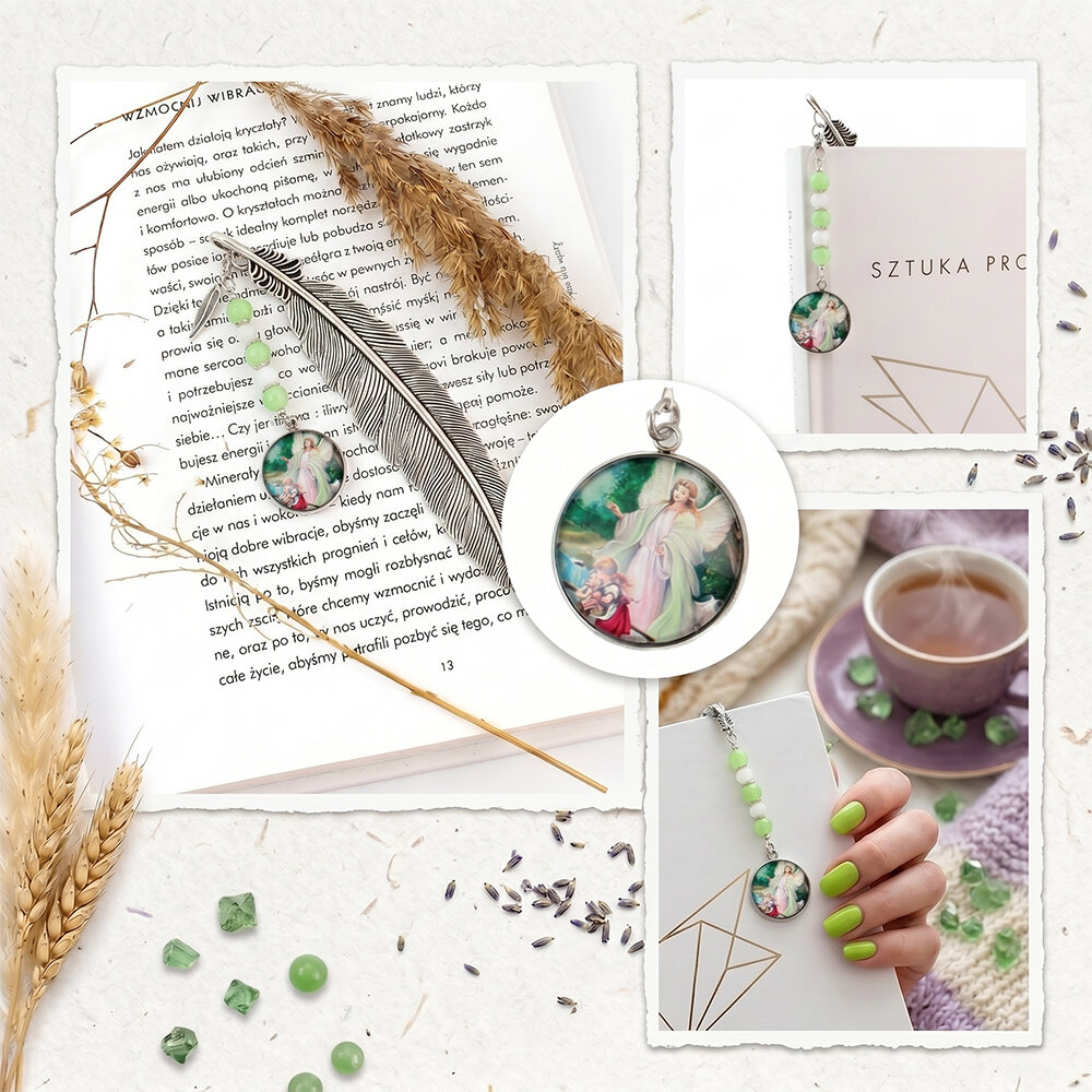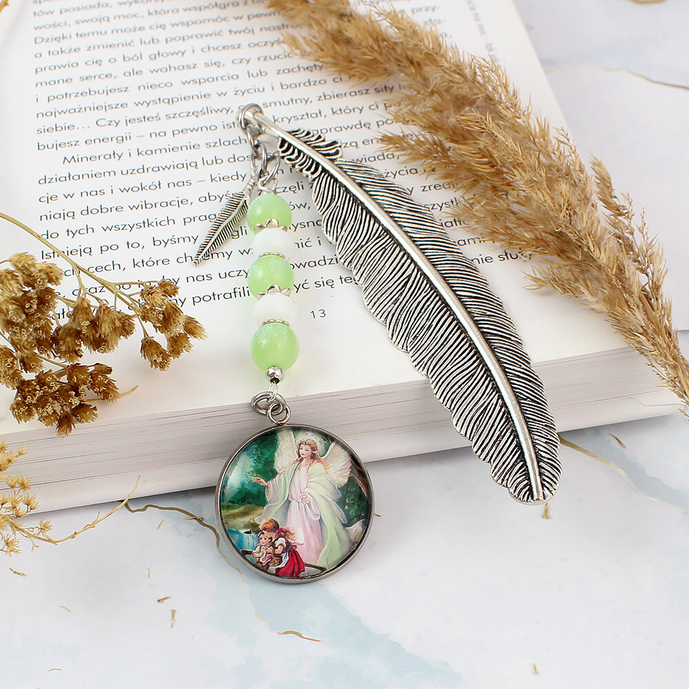 Ręcznie robiona zakładka do książki Anioł Stróż z ilustracją opiekuńczej postaci pod szklanym kaboszonem i subtelnymi koralikami.