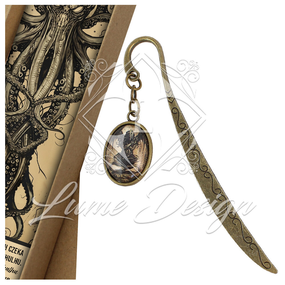 Ręcznie wykonana zakładka do książki, z której bije mrok i aura prastarych tajemnic. Pod owalnym, szklanym kaboszonem kryje się grafika przedstawiająca kultowy posążek (idol) Cthulhu – bezpośrednie nawiązanie do klasyki horroru autorstwa H.P. Lovecrafta.