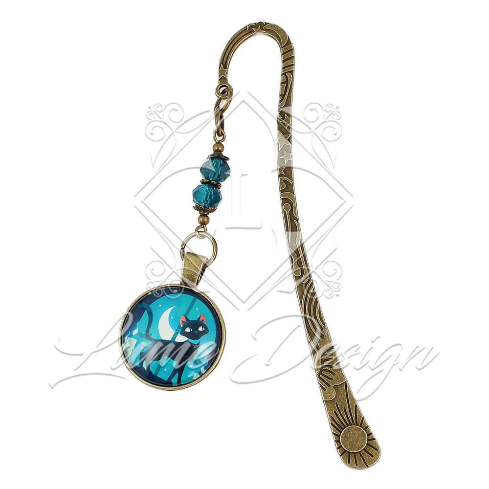 Zakładka do książki z antycznego brązu z motywem słońca i gwiazd, turkusowymi kryształkami i ilustracją czarnego kota na tle księżyca