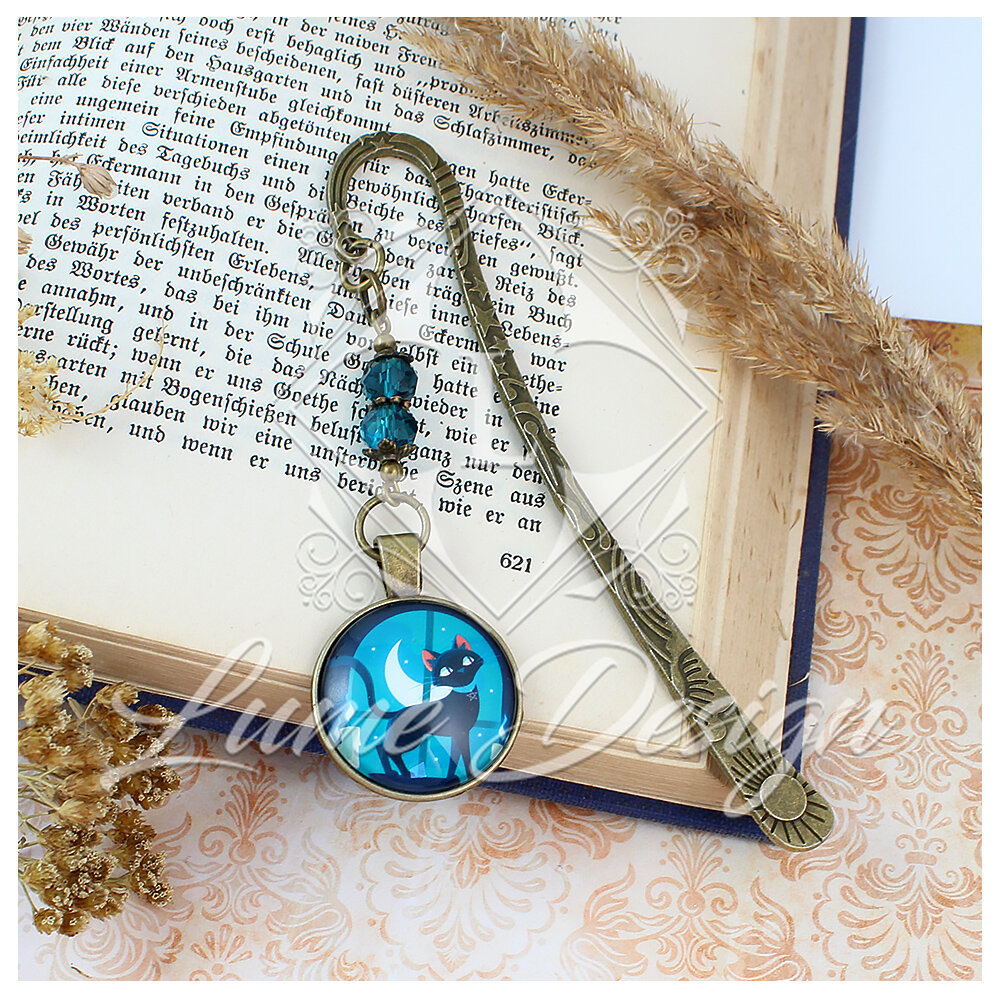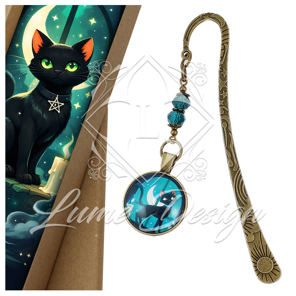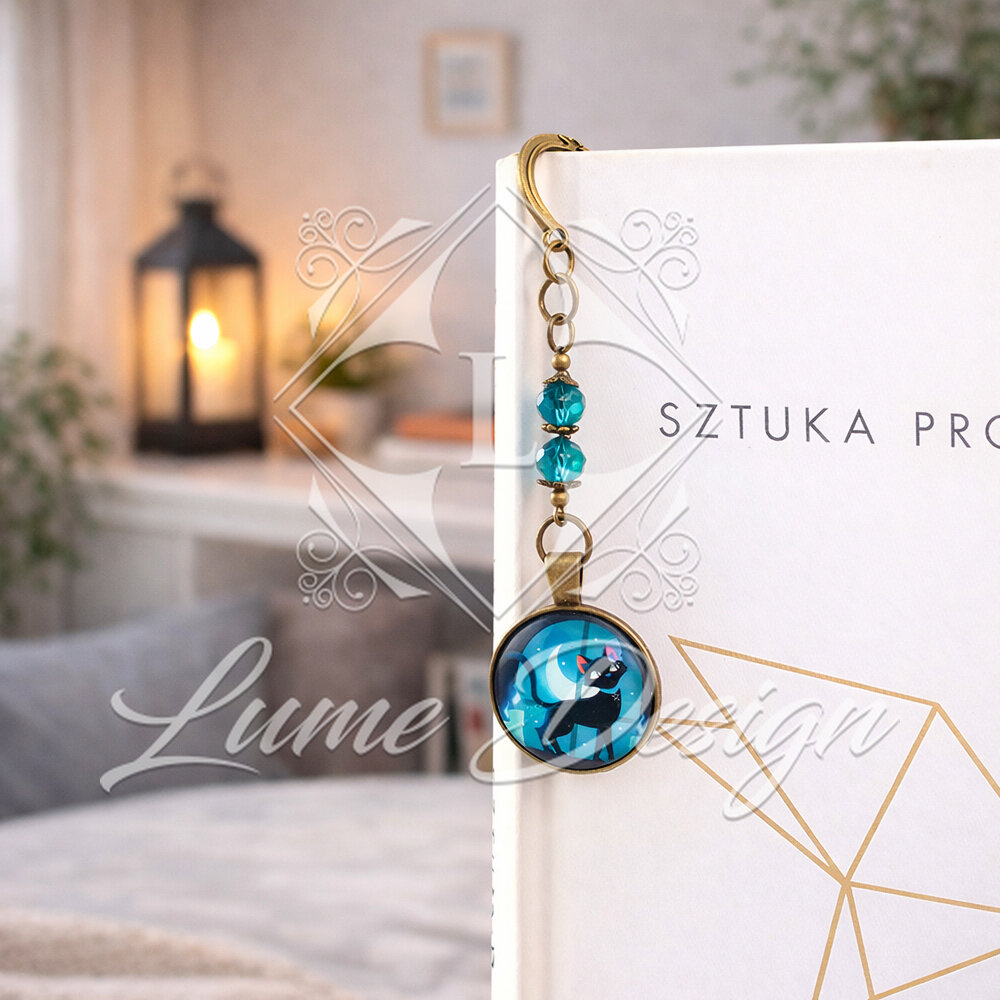 Ręcznie wykonana zakładka, obok której nie przejdzie obojętnie żadna miłośniczka magicznych opowieści. Grafika ukryta pod szklanym kaboszonem przedstawia czarnego kota i księżyc. Wyjątkowy trzon z motywem słońca i gwiazd oraz szklane, niebieskie kryształki doskonale wpisują się w klimat "witchy" i literaturę fantasy.