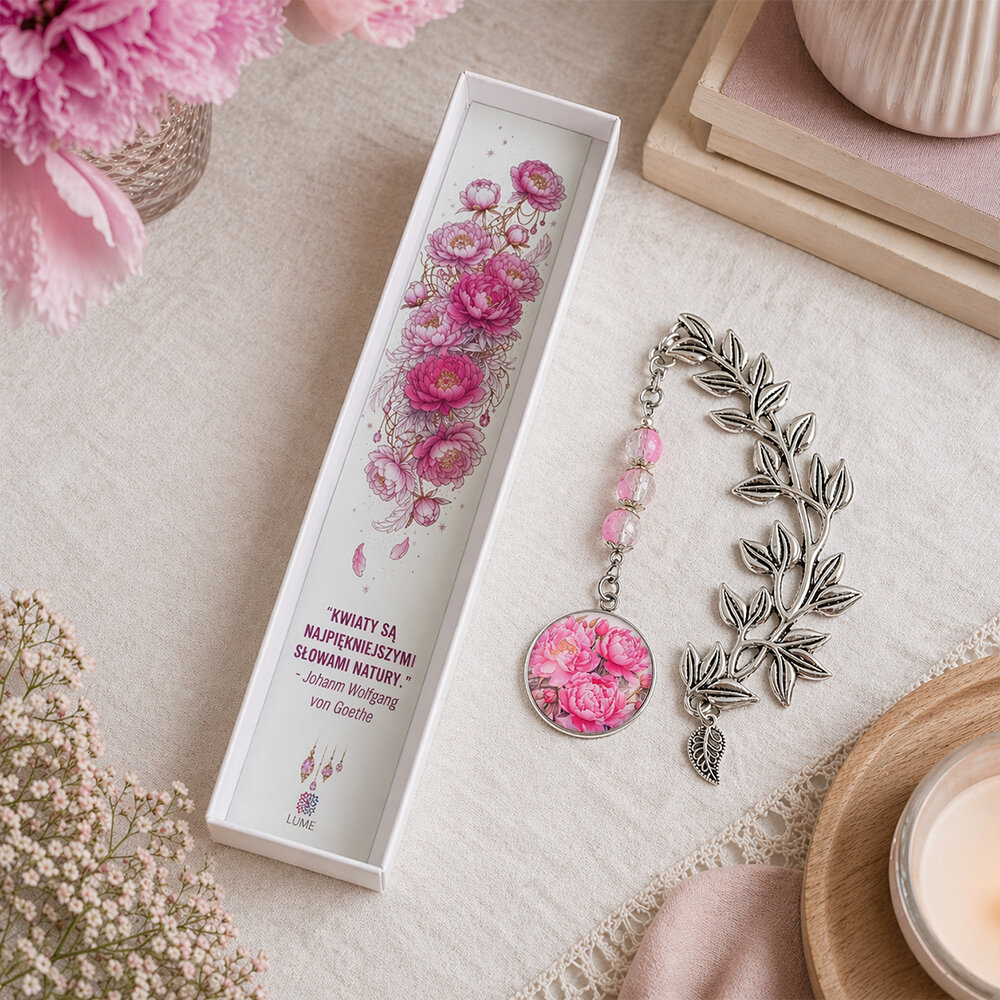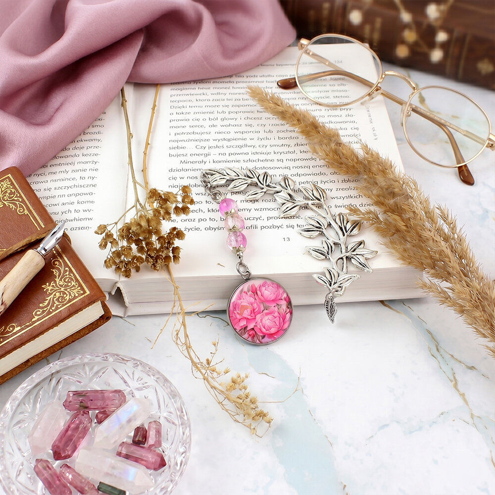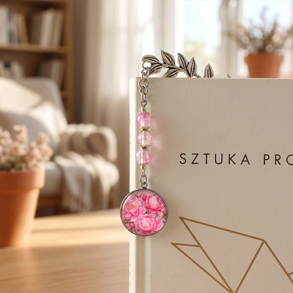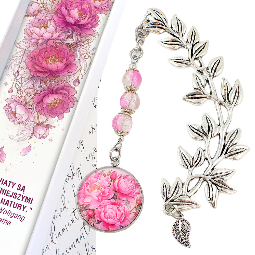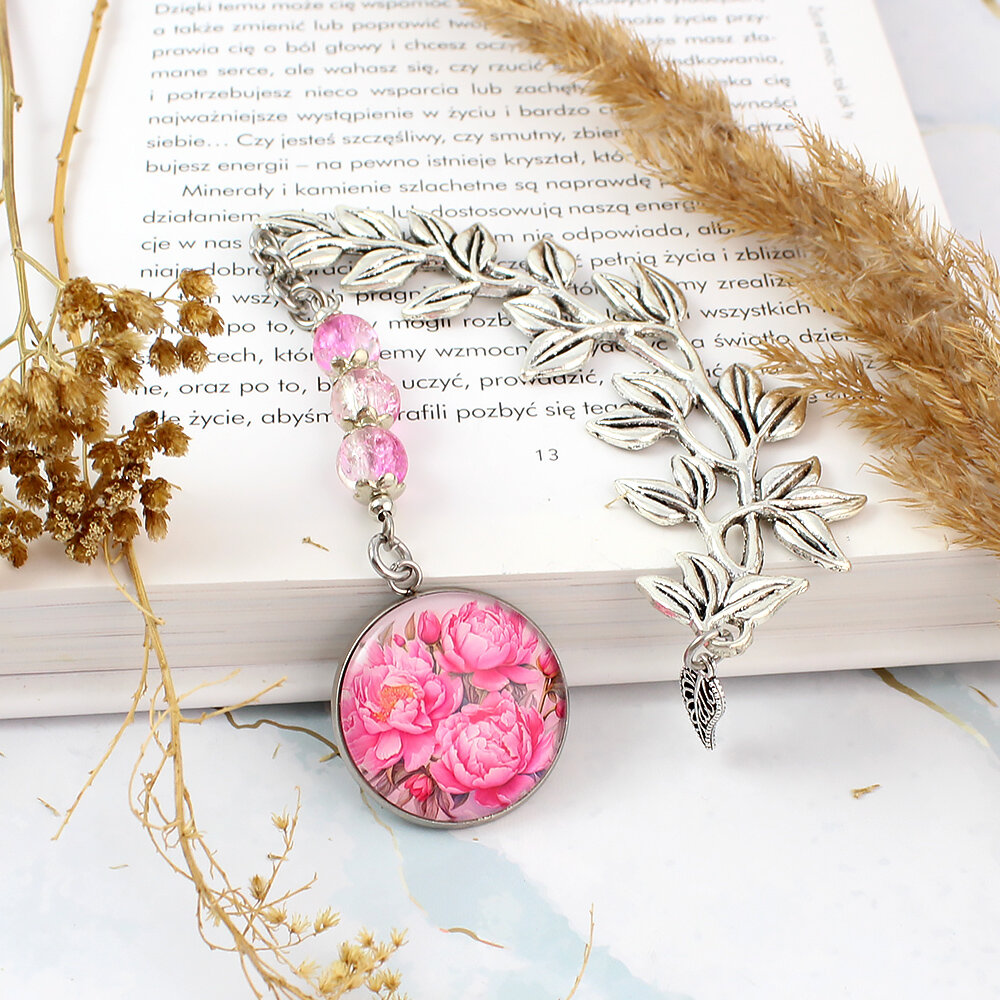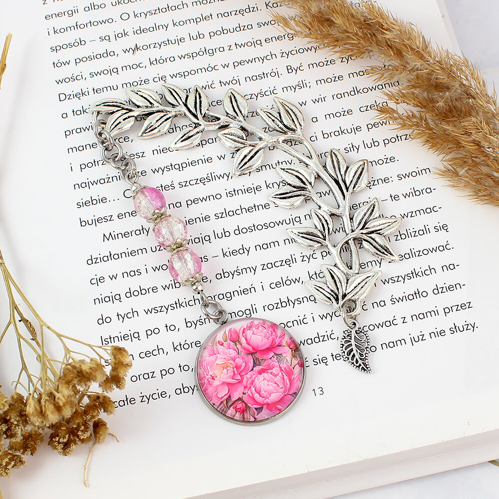 Ręcznie robiona zakładka do książki z piwoniami w rozkwicie, zamkniętymi pod szklanym oczkiem, podwieszona na pięknej, metalowej gałązce z listkami.