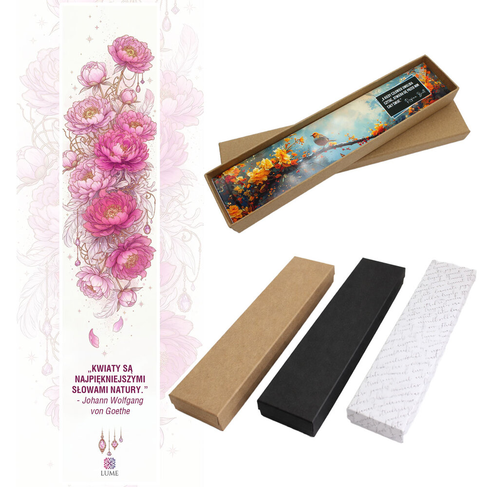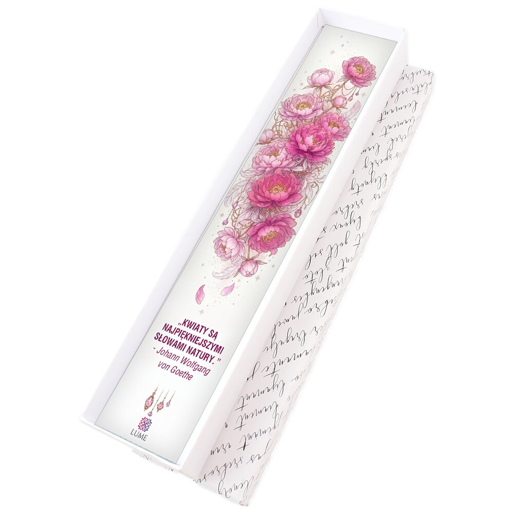 Zakładka zapakowana jest w ozdobne pudełko z wkładką, na której widnieje poetycki cytat o kwiatach. Gotowa do wręczenia przy każdej uroczystej okazji.