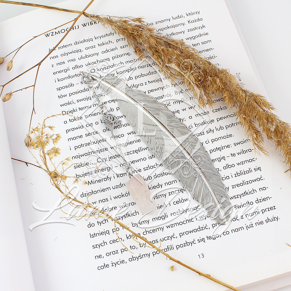 Ozdobna zawieszka łączy w sobie symbolikę stalowej róży z naturalnym pięknem kwarcu. Każdy kamień posiada unikalny układ inkluzji i nasycenie barwy, co sprawia, że każda zakładka jest jedynym w swoim rodzaju egzemplarzem rękodzieła.