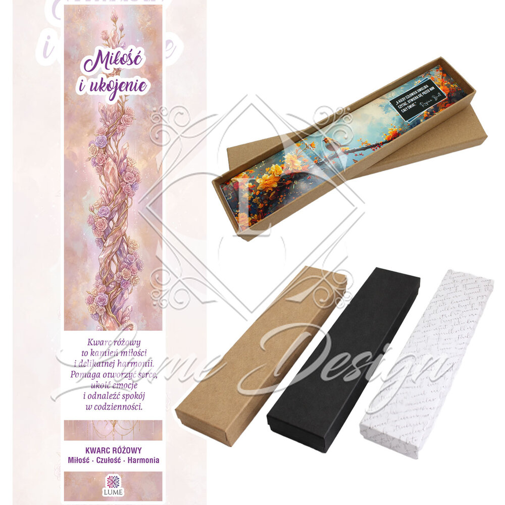 Zakładka zapakowana jest w ozdobne pudełko z dedykowaną wkładką. Znajduje się na niej opis znaczenia użytego kamienia oraz informacja o jego dobroczynnym działaniu.