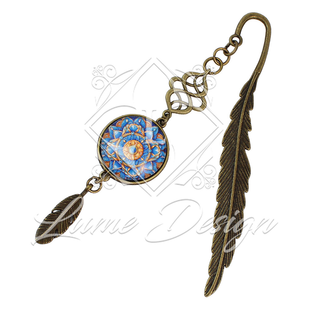 Ręcznie wykonana zakładka do książki, przyciągająca oko skomplikowanym wzornictwem i piękną paletą barw. Grafika pod wypukłym, szklanym kaboszonem przedstawia wielobarwną mandalę przywodzącą na myśl rozkwitający kwiat.
