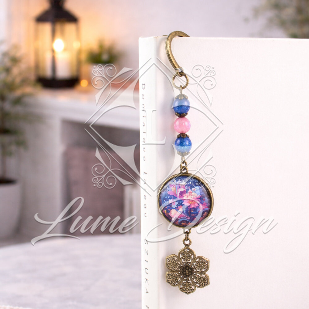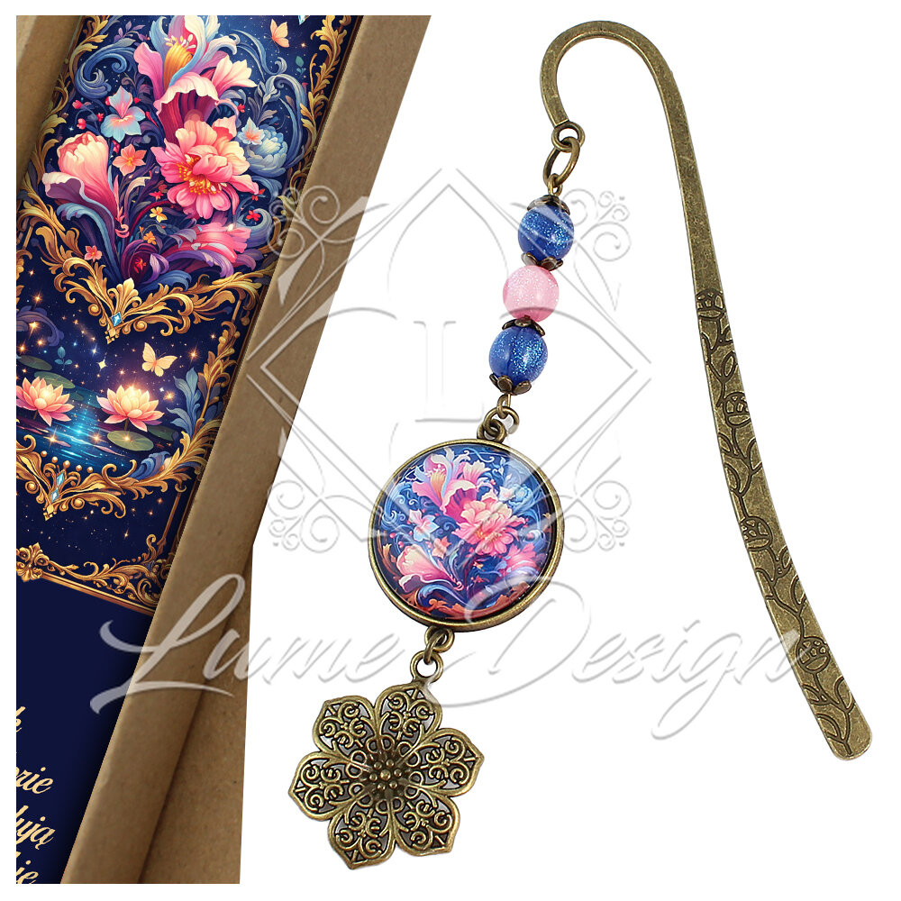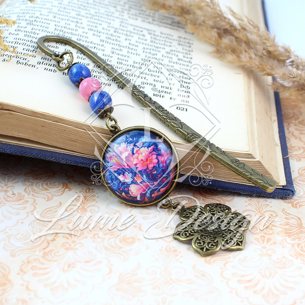 Zakładka do książki z antycznego brązu z niebieskim koralikiem i niebiesko-różowymi, kwitnącymi kwiatami pod szklanym kaboszonem.