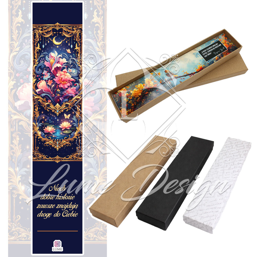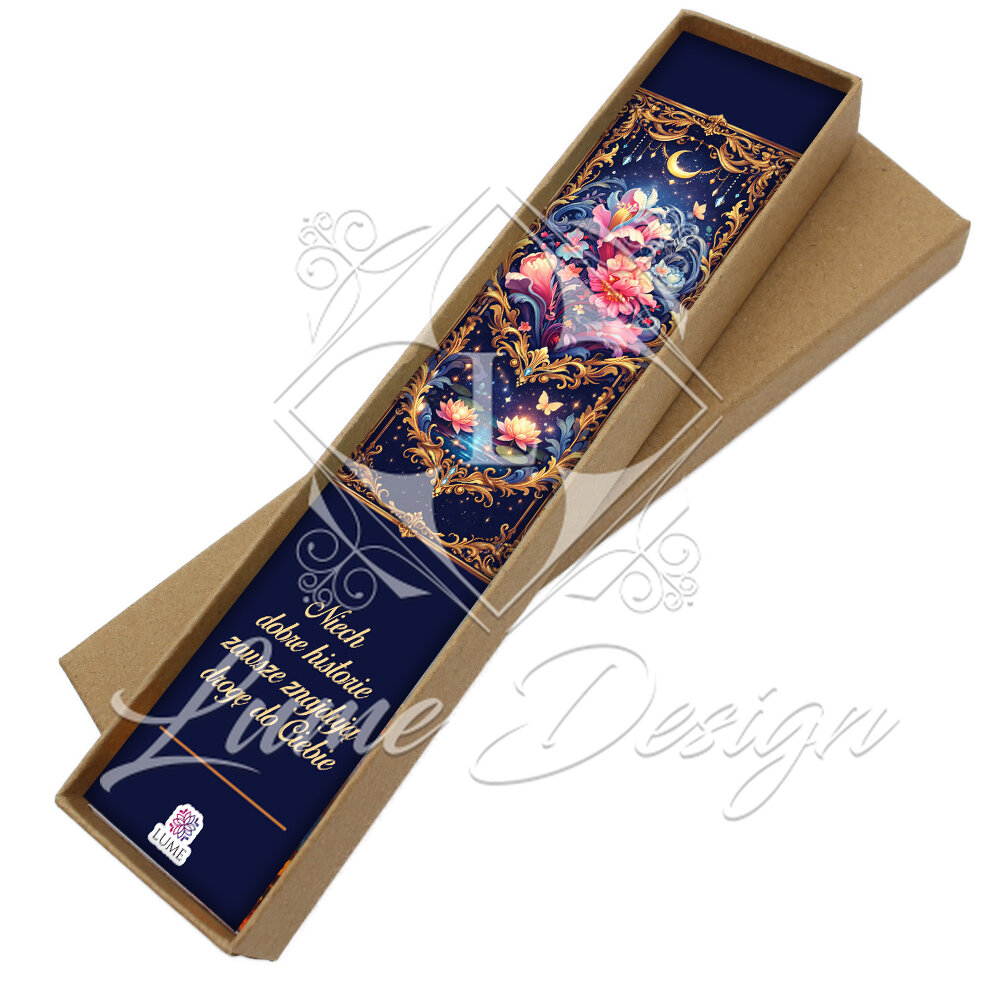 Każda zakładka zapakowana jest w ozdobne pudełko z wkładką, na której znajduje się piękny cytat.