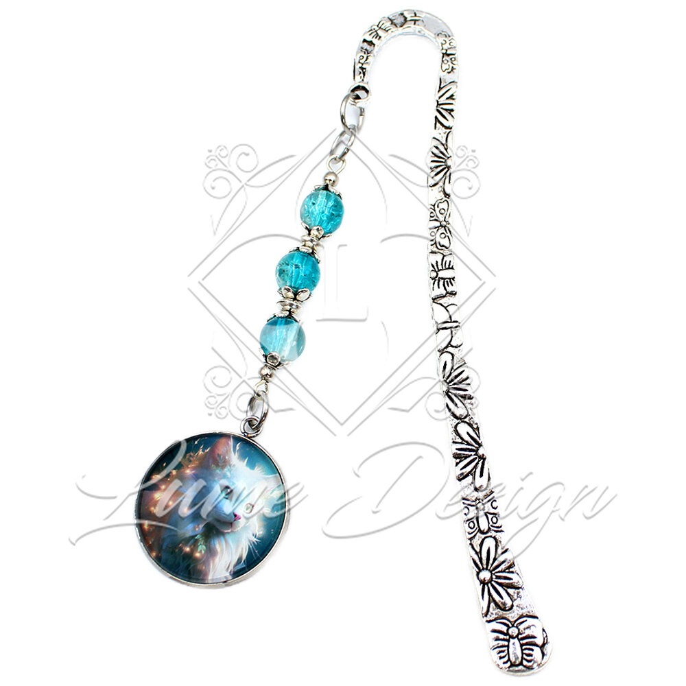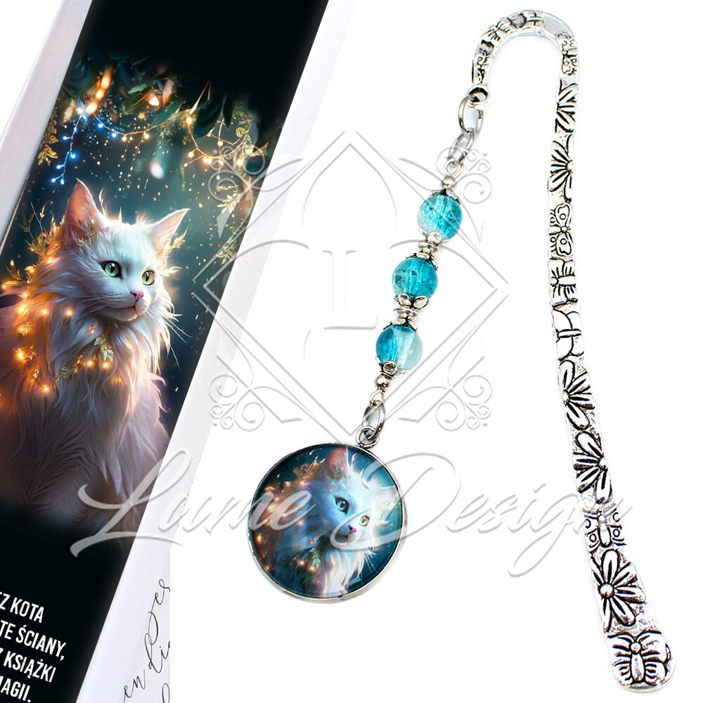 Zakładka do książki z autorską grafiką zamkniętą pod wypukłym szkiełkiem. Ręcznie wykonana zakładka, która zachwyci każdą miłośniczkę mruczących czworonogów. Grafika przedstawia niezwykle urokliwego, białego długowłosego kota w magicznej, iskrzącej się poświacie.