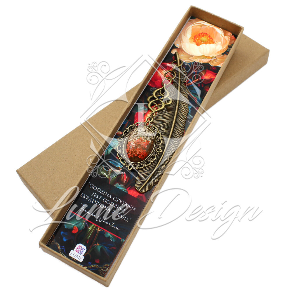 Każda zakładka jest zapakowana w ozdobne pudełko z wkładką, na której znajduje się piękny cytat. Jeśli chcesz, mogę zastąpić go Twoją dedykacją lub krótkim tekstem, co sprawi, że zakładka będzie jeszcze bardziej osobistym upominkiem. Kolor i wzór pudełka wysyłany losowo, zawsze w estetycznym wydaniu.