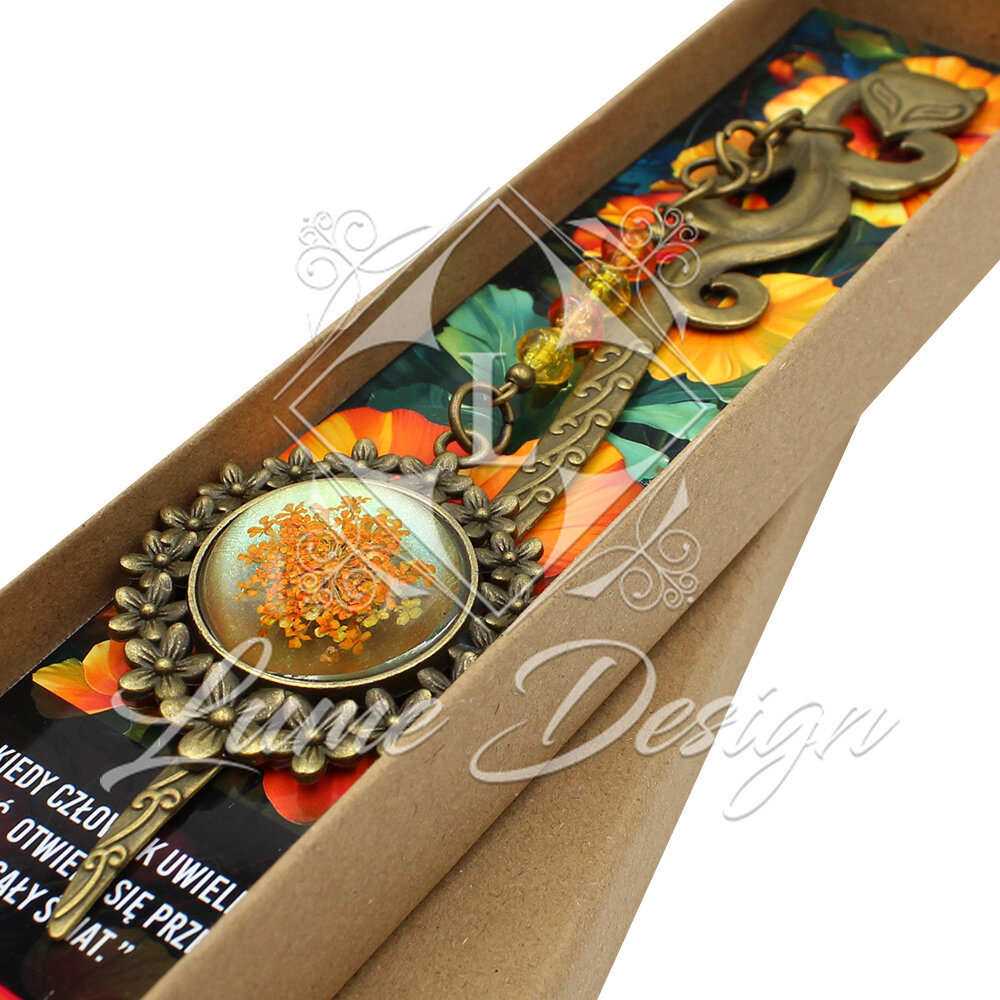 Każda zakładka jest zapakowana w ozdobne pudełko z wkładką, na której znajduje się piękny cytat. Jeśli chcesz, mogę zastąpić go Twoją dedykacją lub krótkim tekstem, co sprawi, że zakładka będzie jeszcze bardziej osobistym upominkiem. Kolor i wzór pudełka wysyłany losowo, zawsze w estetycznym wydaniu.