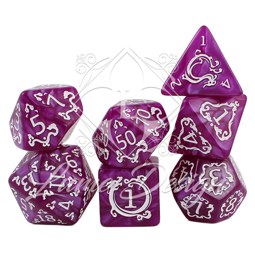Kości te są nasycone klimatem epickiej fantazji i starożytnych legend. Każda ścianka, otoczona misterną, ozdobną ramką, zdaje się chronić wizerunek wijącego się smoka, strzegącego wyniku rzutu. Fiolet, kojarzony z mistyką, królewskością i magią, sprawia, że ten zestaw wydaje się być wykuty z nasyconych magią ametystów lub odłamków skrystalizowanej smoczej krwi. Białe, perłowe cyfry kontrastują ze śliwkowym tłem, zapewniając doskonałą czytelność nawet w przygaszonym świetle karczmy.