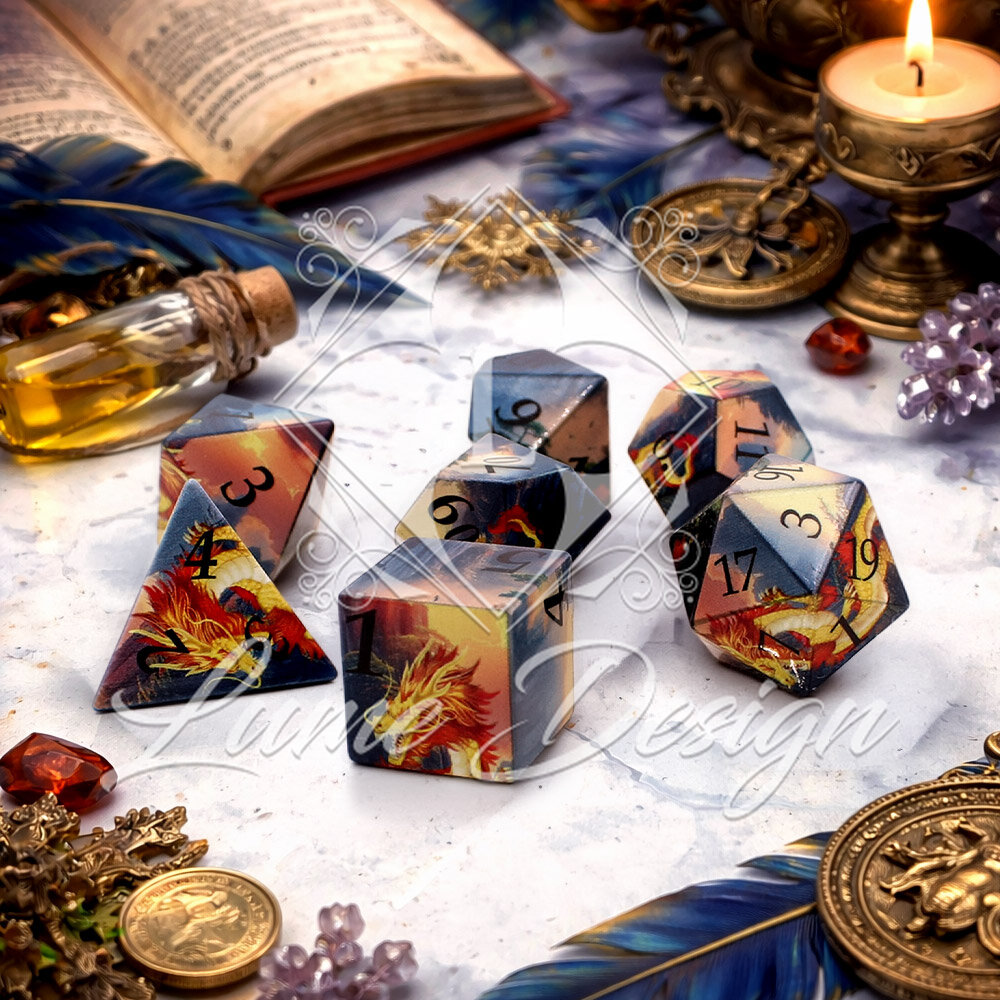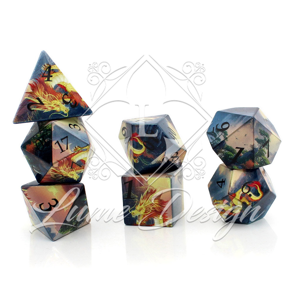 Dragon Spirit to zestaw kości inspirowanych legendami o potężnych smokach Wschodu. Ilustracyjne wykończenie nadaje kościom unikalny, mistyczny charakter, jakby każda z nich była fragmentem opowieści o pradawnej mocy.