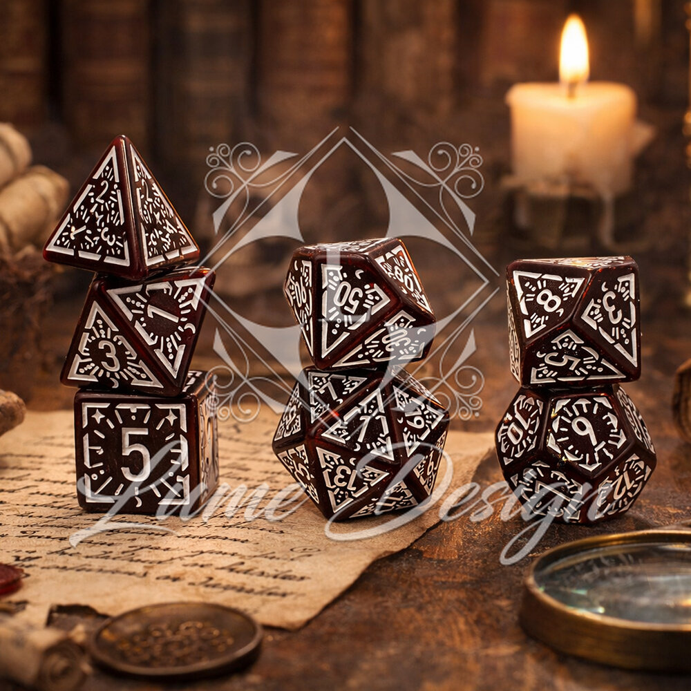 Zestaw kości wielościennych RPG bordowe runiczne zaokrąglone DnD