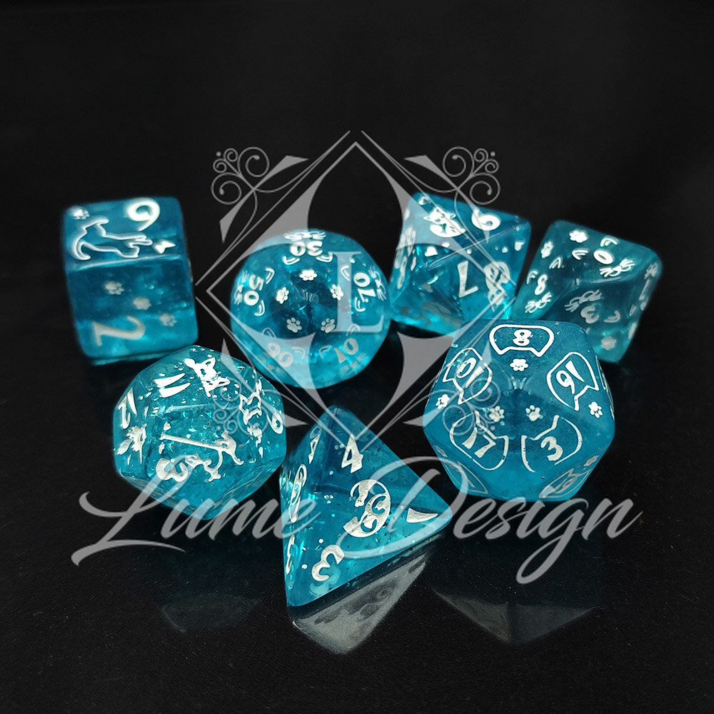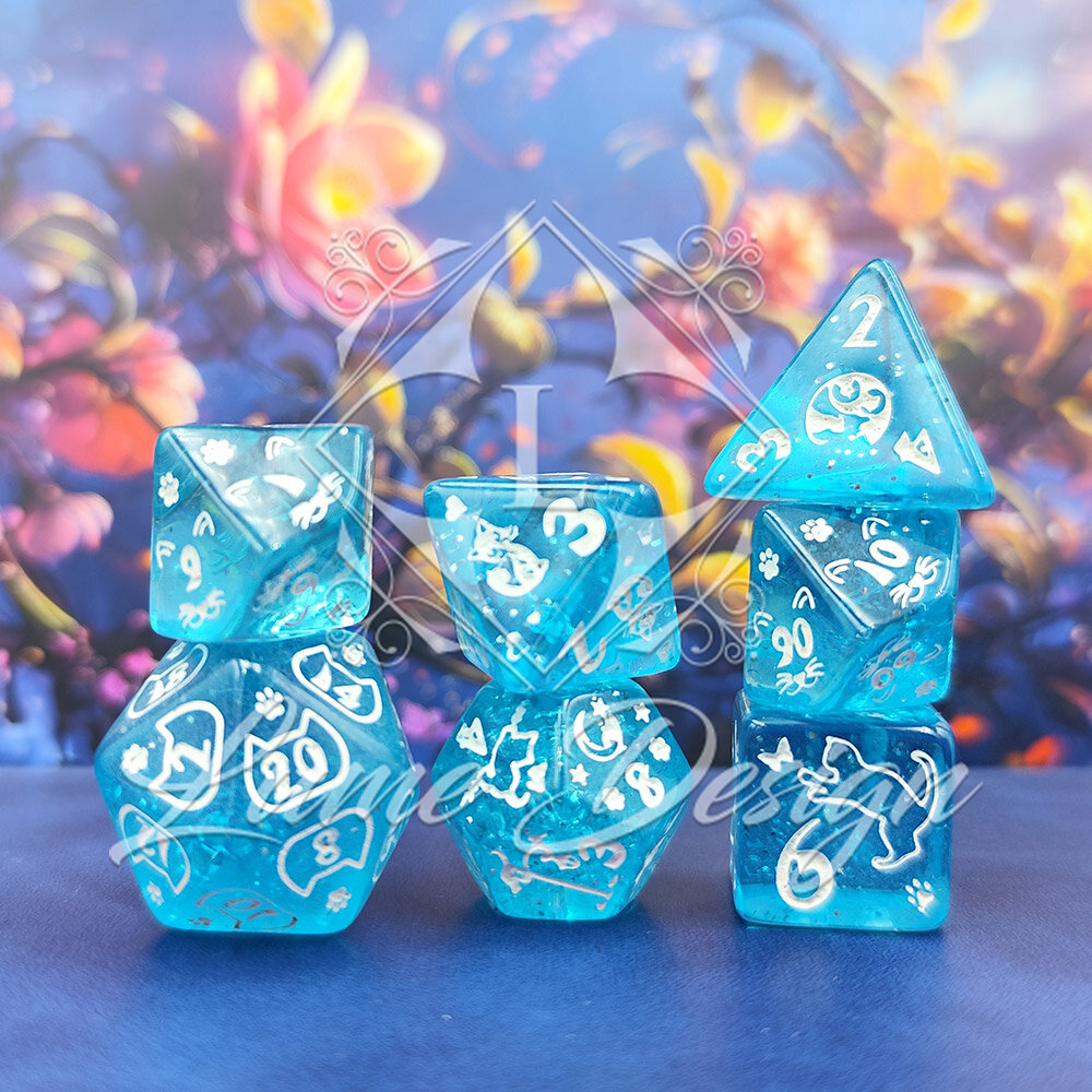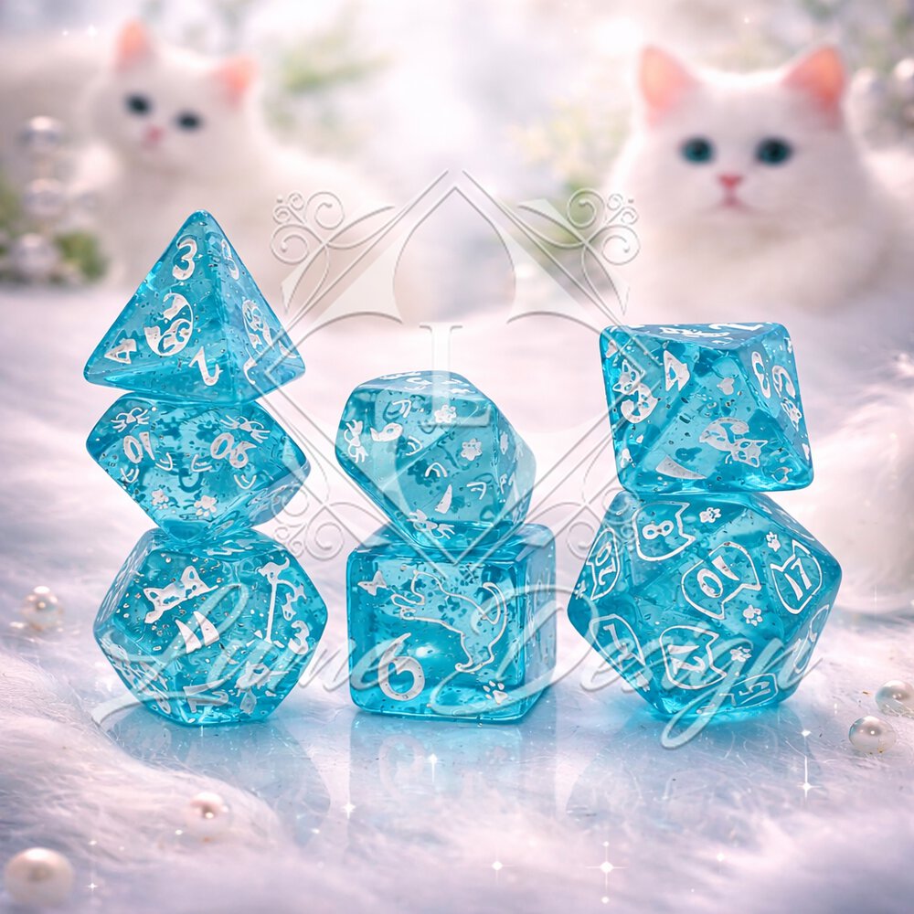 Cat Magic Dice to komplet wielościennych kości RPG z uroczym motywem kotów. Błękitna, transparentna forma oraz delikatnie mieniące się wnętrze sprawiają, że kości są lekkie wizualnie, radosne i wyjątkowo przyjemne w odbiorze.