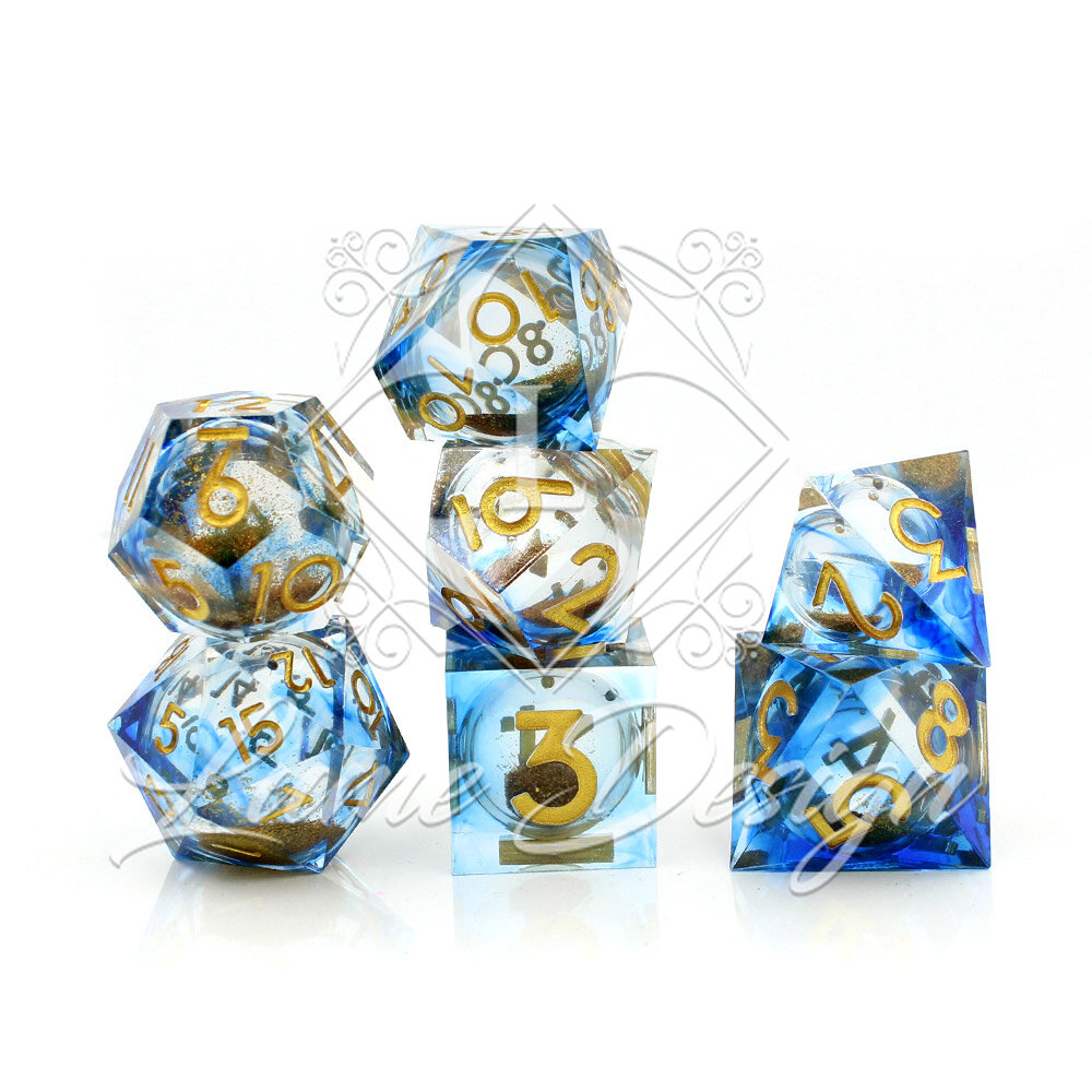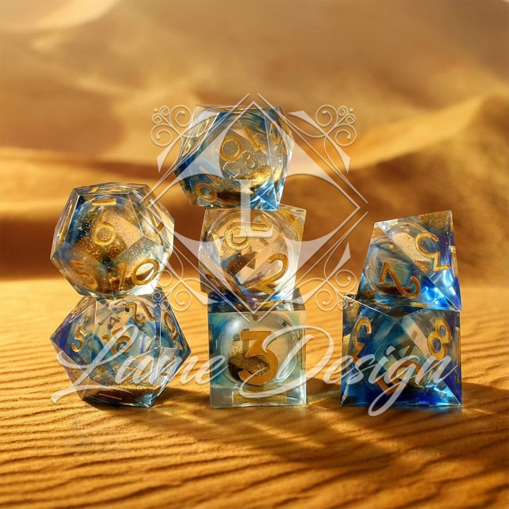 Sand of Time to zestaw kości RPG z płynnym rdzeniem, w którym znajduje się ruchomy złoty piasek inspirowany pustynnymi wydmami. Podczas rzutu drobinki poruszają się wewnątrz kości, tworząc hipnotyzujący, żywy efekt. Transparentne odcienie błękitu i złota nadają zestawowi elegancki, magiczny charakter.