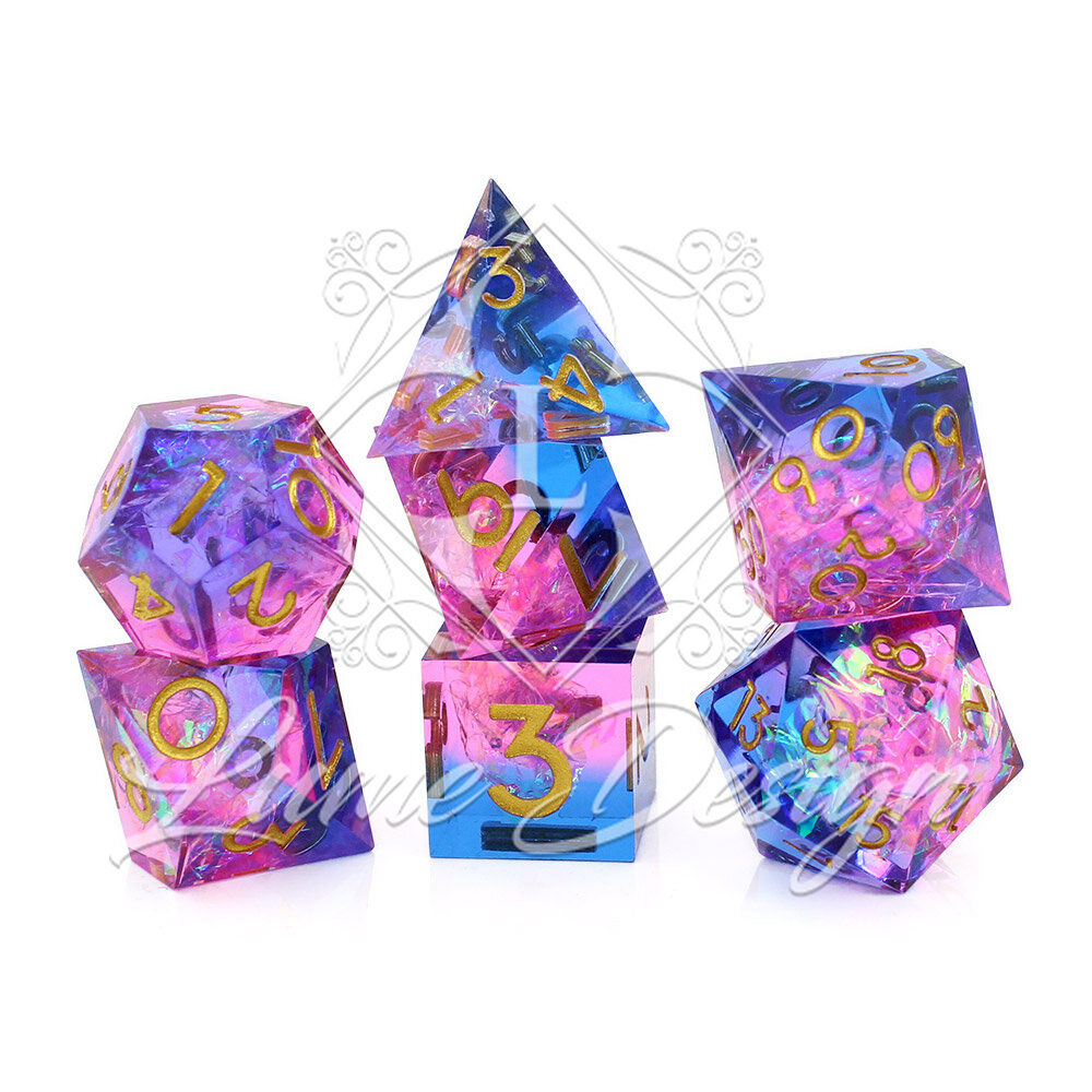Prismatic Aura to zestaw kości RPG o magicznym, pryzmatycznym efekcie. Wnętrze kości mieni się wielobarwnymi refleksami, które zmieniają się w zależności od światła i kąta patrzenia. Połączenie różu, błękitu i tęczowego blasku nadaje zestawowi fantastyczny, niemal eteryczny charakter.