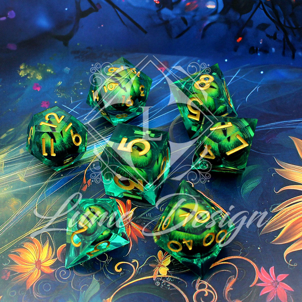 Eye of the Dragon to zestaw wielościennych kości RPG wykonanych z żywicy, z efektem liquid core. Wewnątrz każdej kości znajduje się ruchome oko, które porusza się podczas rzutu.